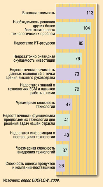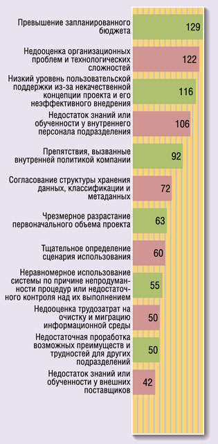 Среди главных препятствий на пути реализации проектов по внедрению СЭД были названы высокая стоимость, необходимость решения других более актуальных технологических проблем, а также недостаток ИТ-ресурсов (рис. 2). А основные проблемы в ходе выполнения проектов — превышение запланированного бюджета, недооценка организационных проблем и технологических сложностей, а также низкий уровень поддержки со стороны пользователей (рис. 3).