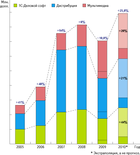 Как известно, бизнес «1С», состоит из трех достаточно самостоятельных направлений: разработка делового софта («1С:Предприятие»), создание мультимедийных продуктов и дистрибуция ПО других поставщиков. Как раз в кризис фирма серьезно усилила свою мультимедийно-игровую составляющую, которая по итогам года выросла процентов на 70 и по объемным показателям намного (почти наполовину) превысила продажи экономического ПО, вплотную приблизившись к объему дистрибуции чужого ПО. Правда, нужно отметить, что такое увеличение было достигнуто не столько за счет естественного роста, сколько путем приобретения в начале 2009 г. компании «СофтКлаб».