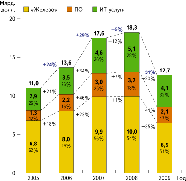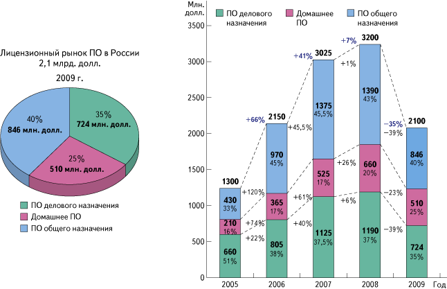 Свое видение ситуации на российском ИТ-рынке фирма «1С» представила еще в декабре прошлого года. Недавно, на прошедшей в Москве выставке «Связь-Экспокомм», директор фирмы Борис Нуралиев представил журналистам уточненный вариант своих оценок (рис. 1) с более оптимистичным показателем объема софтверной составляющей (сейчас — 2,1 млрд. долл., в декабре — 1,9 млрд. долл.). В этих данных приведена и структура программного рынка страны: сегмент домашнего ПО оказался в кризисных условиях более устойчивым по сравнению с корпоративным сектором и за год увеличил свою долю с 20 до 25%.