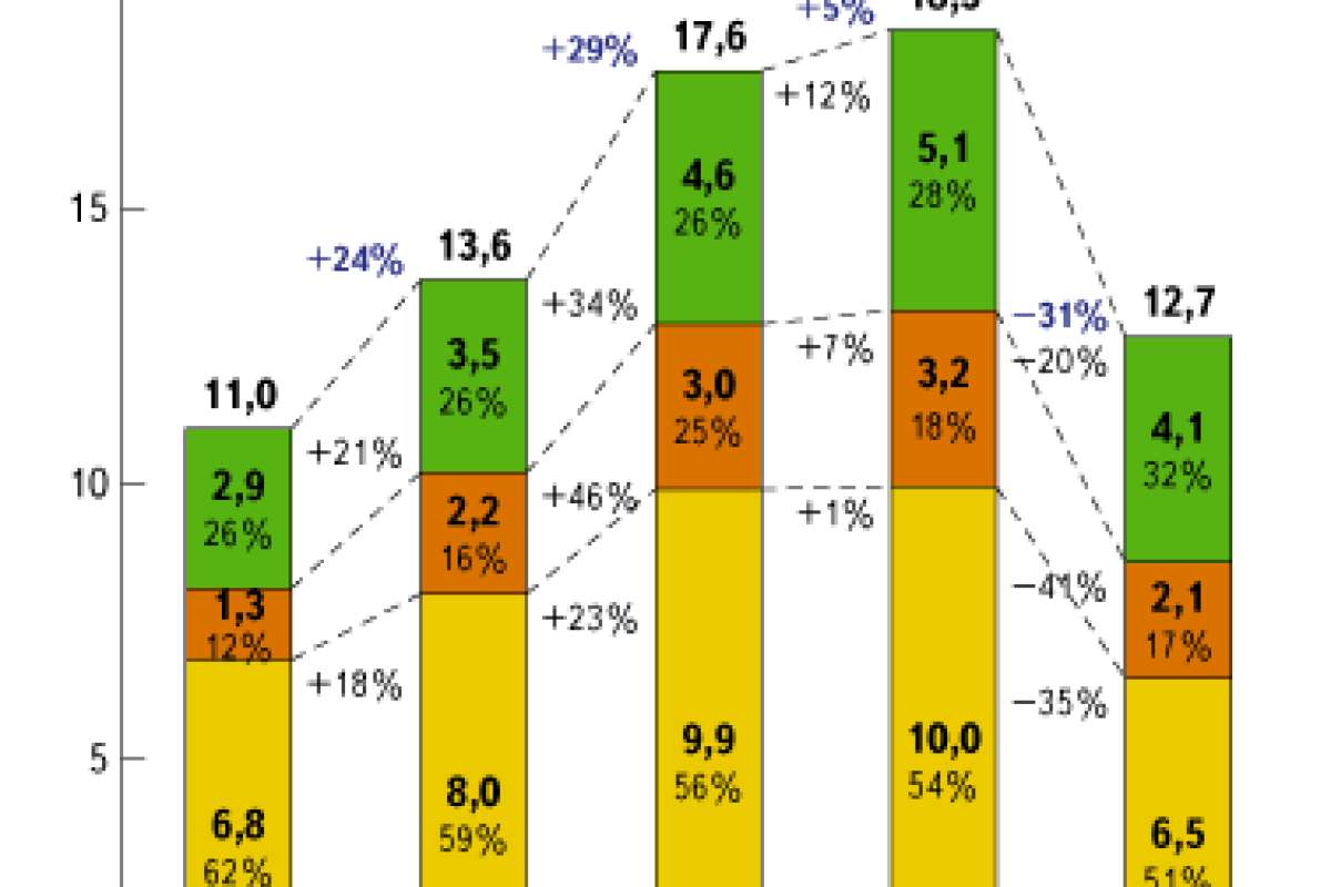 В целом в I квартале этого года «1С» уверенно вышла на показатели докризисного 2008 г., показав в годовом разрезе рост 25,8%. Причем в этот период больше всего увеличилось направление делового ПО (+44%), что говорит о восстановлении спроса на корпоративном рынке. Опережающими темпами росли продажи «1С:Бухгалтерии 8» (+60%), «1С:Управление Торговля» и «1С:Розница» (+72%), «1С:Зарплата и управление персоналом 8» (+84%).