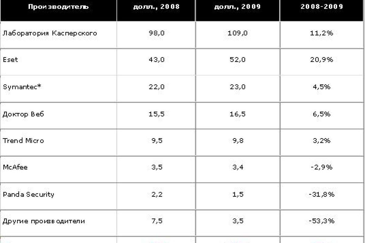 Как мы видим из таблицы 2, в 2009 году на рынке не произошло серьезных изменений. «Лаборатория Касперского» и Eset немного увеличили свои доли рынка, что лишний раз подтверждает тезис о том, что лидеры рынка имели больше возможностей и лучше других переживают кризисные годы.
