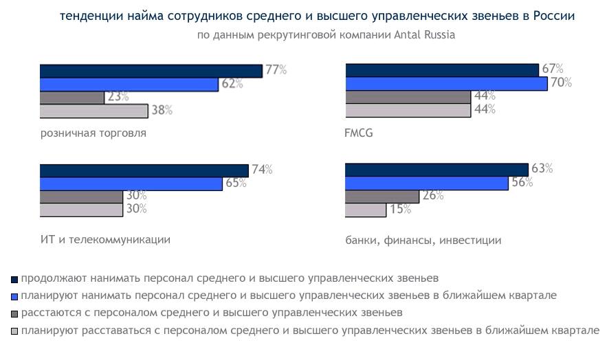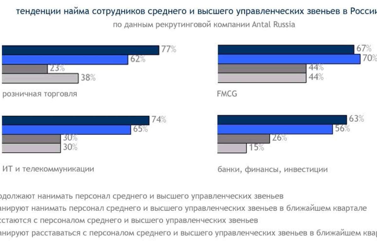 По данным рекрутинговой компании Antal Russia исследование, в котором приняли участие около 9 700 компаний в 55 странах мира показало, что несмотря на продолжающуюся неустойчивость посткризисной экономики, компании продолжают все более активно набирать персонал среднего и высшего управленческих звеньев.Россия, где 66% из 220 опрошенных компаний открывает новые вакансии для менеджеров разного уровня, сохраняет лидерские позиции в Европе наряду с Бельгией (66%), снова оставив позади ключевые экономики. Германия воздерживается активного найма, и только 41% работодателей готовы открывать новые вакансии. Великобритания по-прежнему отстает от России (60%). При этом в мировых лидерах такие страны, как Канада (76%), Египет (75%), Малайзия (75%), Саудовская Аравия (74%) и Аргентина (74%). Удивляют результаты, которые показал опрос компаний, ведущих бизнес в Украине (где было опрошено только около 30 компаний, преимущественно международных). 68% работодателей признались в том, что активно берут в штат новых менеджеров. Вероятно, они все еще пополняют управленческие команды после сложного кризисного года.