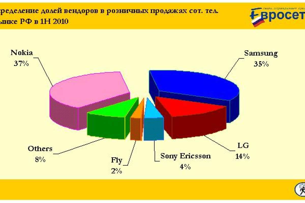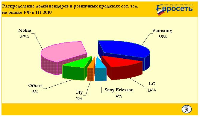 Доли вендоров в продажах (в штучном выражении) по итогам первого полугодия распределились следующим образом: Nokia - 37%, Samsung - 35%, LG - 14%, Sony Ericsson - 4%, Fly - 2%, другие - 8%.По результатам первого полугодия, Nokia остается на первом месте, однако производитель потерял лидирующую позицию во втором квартале 2010 (34,1%). Ближайший соперник Nokia, Samsung во втором квартале нарастил долю (34,5%), выйдя на первое место, по результатам же всего полугодия вендор занимает второе место. LG, занимающая третье место на рынке сотового ретейла РФ, продолжила активно увеличивать долю рынка и подняла ее с 12% в первом квартале до 15% во втором.