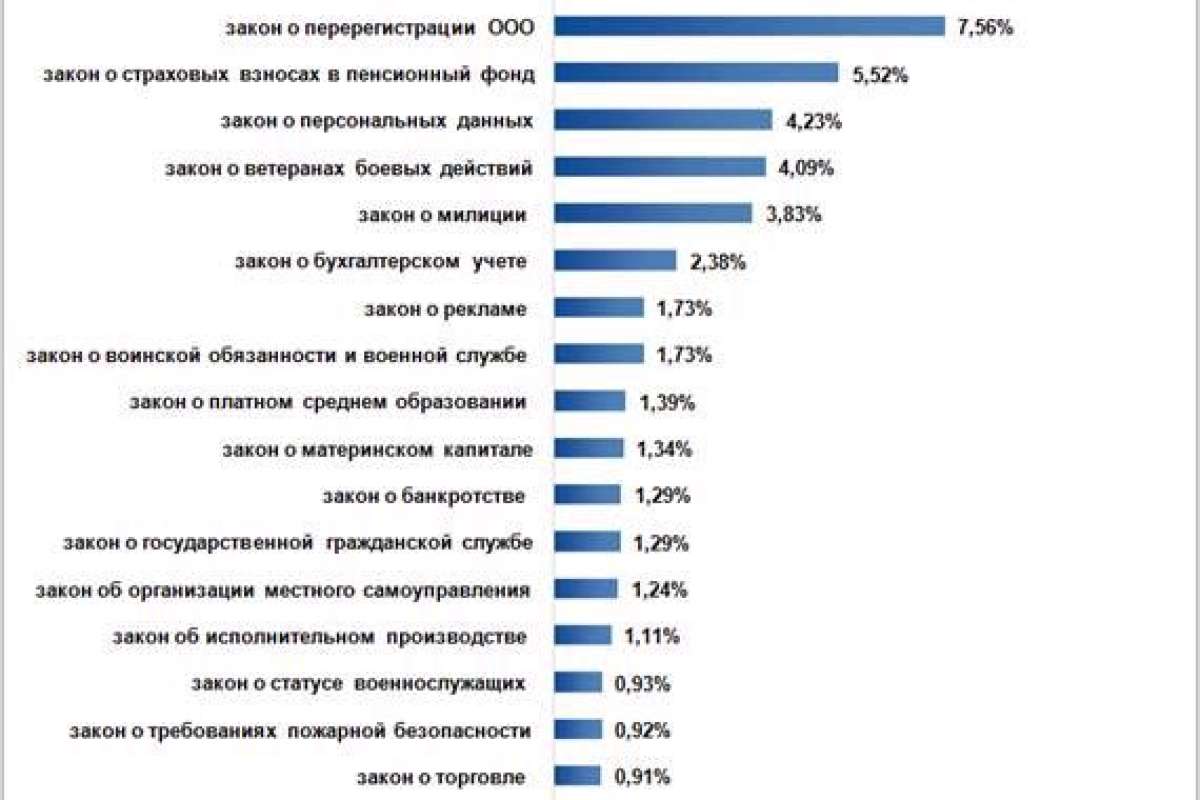 Замыкает тройку лидеров закон о страховых пенсионных взносах (5,52%). Интерес к данному документу, вероятно, обусловлен реформой единого социального налога. С января 2010 года произошла замена ЕСН на страховые взносы во внебюджетные социальные фонды.