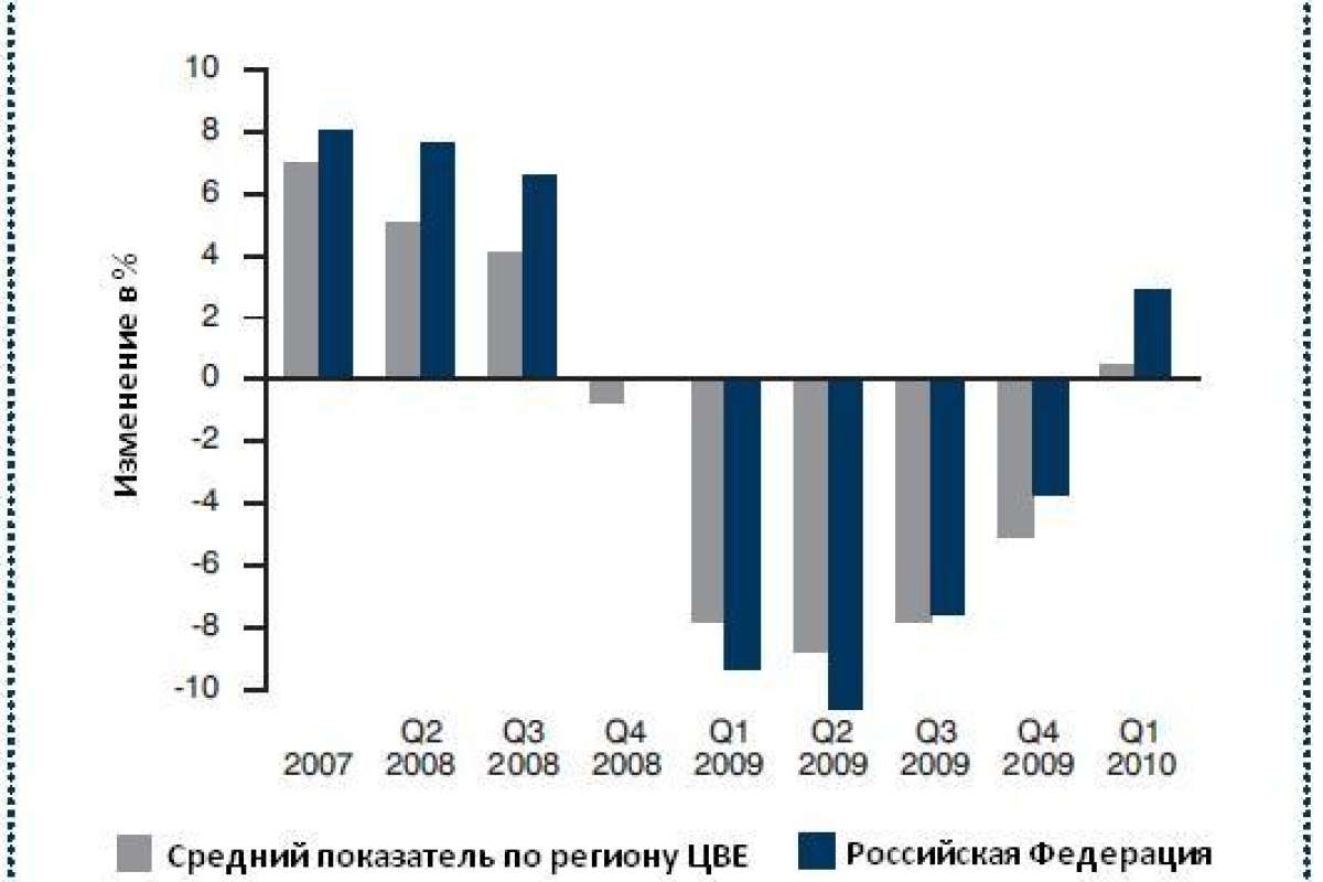 Мировой кризис значительно повлиял на экономику России. Быстрые темпы роста ВВП на уровне 6–8% в докризисный период резко сократились до -8% осенью 2009 года.