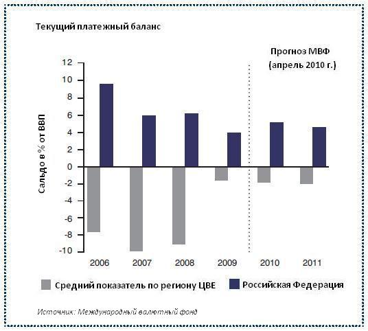 Россия была единственной в регионе ЦВЕ страной, имеющей положительное сальдо платежного баланса как до, так и после кризиса. Тем не менее, профицит существенно снизился в период мирового кризиса: с 6,2% от ВВП в 2008 году до 3,6% в 2009 году. Такой результат не был неожиданным с учетом масштаба мер по стимулированию экономики, реализованных правительством в 2009 году. В ближайшие годы вновь ожидается увеличение положительного сальдо платежного баланса.
