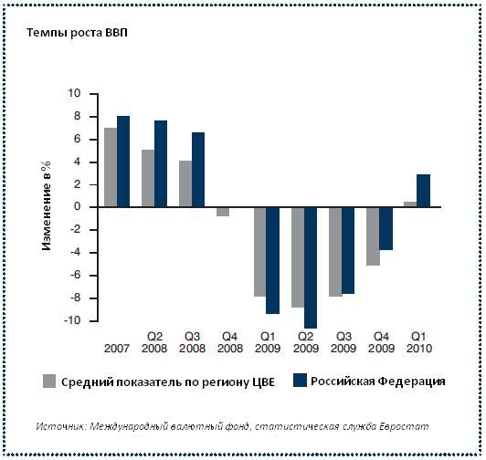 Благодаря росту цен на нефть и политике стимулирования и поддержки банков и компаний, российская экономика восстанавливается после спада производства. Ожидаемые в 2010 году темпы роста составят 3,7%, при этом сохранение тенденции к росту прогнозируется и на 2011 год. Однако если мировая экономика вновь окажется в рецессии и цены на нефть в очередной раз упадут, возможность применения политики стимулирования спроса будет гораздо более ограниченной, чем в 2009 году.