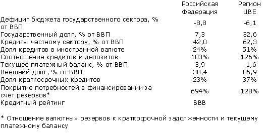Несмотря на потрясение, Россия, в отличие от большинства стран ЦВЕ, находилась в относительно комфортном положении. Политика управления огромным профицитом бюджета и накопления валютных резервов до кризиса в противовес расходованию случайных прибылей от экспорта нефти и газа позволила правительству применить пакет мер по стимулированию экономики страны как ответ на рецессию.