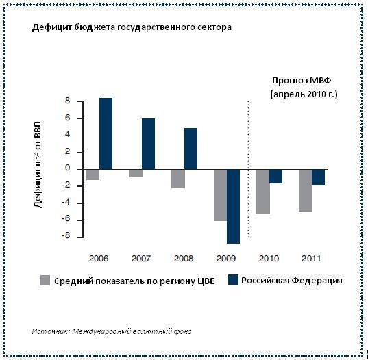 Существенные вливания в российскую экономику в рамках программы стимулирования не прошли незаметно для финансовой системы. Дефицит государственного бюджета существенно увеличился, достигнув отметки -8,8% от ВВП в 2009 году, тогда как докризисные годы характеризовались профицитом на уровне 5–8% от ВВП. И хотя цена, которую российское правительство заплатило, чтобы защитить экономику от кризиса, была довольно высокой, финансовая система страны имеет все шансы на достаточно быстрое восстановление при условии сохранения цен на нефть на текущем уровне или их увеличения. Ожидается, что в ближайшие годы дефицит государственного бюджета снизится до уровня ниже -2% от ВВП.