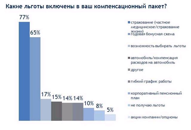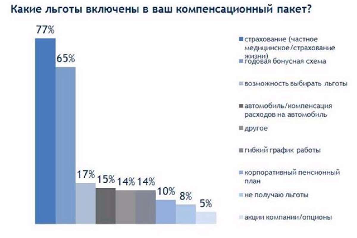 Наиболее распространенными составляющими компенсационного пакета HR-специалистов являются медицинская страховка и годовая бонусная схема – таковы результаты исследования, проведенного Antal Russia среди 250 профессионалов в области HR. Со значительным отрывом за ними следуют корпоративная машина или компенсация расходов на автомобиль и возможность самостоятельно выбирать из ряда предложенных бенефитов.