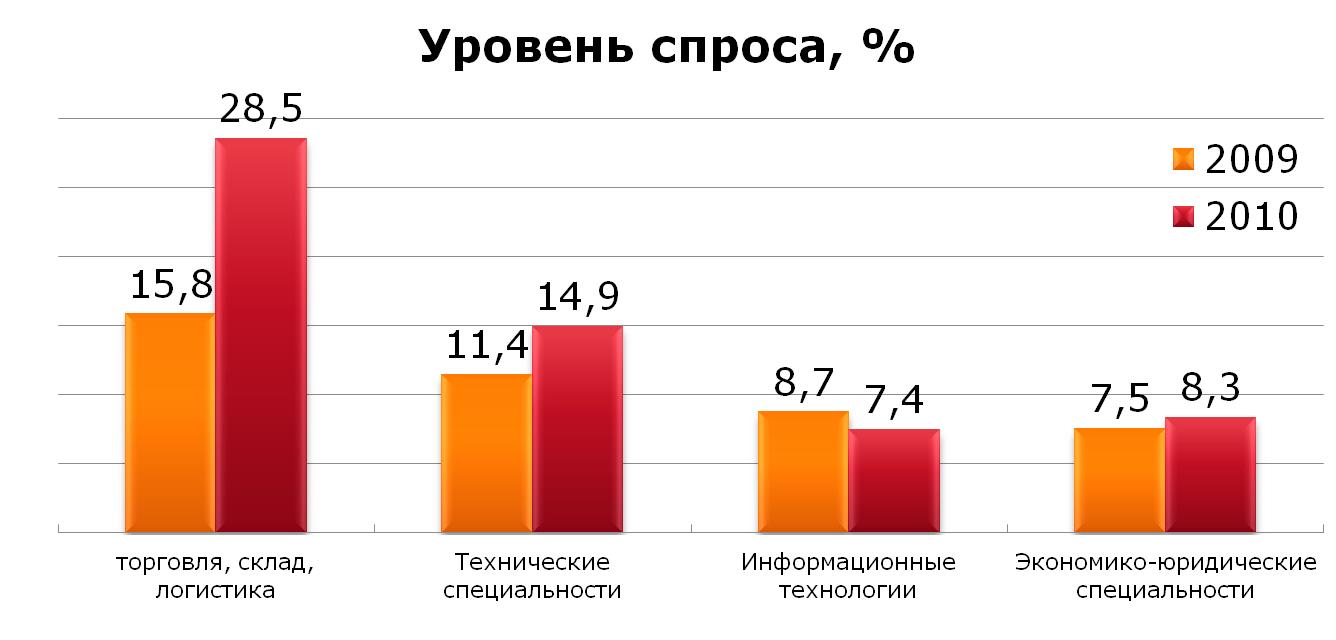 Одновременно с этим, резко вырос спрос на менеджеров, а так же руководителей низшего и среднего звена со стороны ИТ-компаний. Кроме этого, отмечается, что в 2010 г. потребность рынка практически во всех ИТ-специалистах была выше, чем в год назад: практически не изменился индекс спроса лишь для «системных администраторов». А «отрицательная динамика» этого показателя была зафиксирована только для одной специальности: инженер.