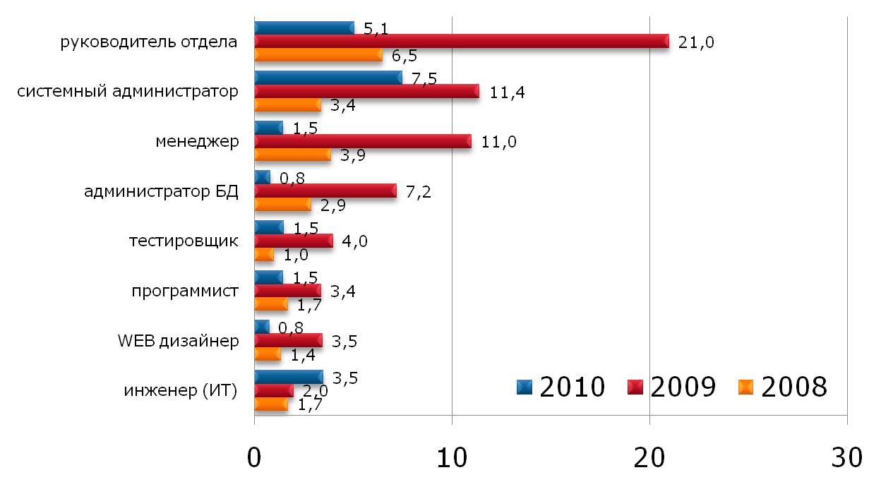 В 2009 г. ИТ-специалисты занимали третье место по уровню спроса, уступая лишь работникам торговли, склада и логистики, а также представителям технических специальностей. Тогда каждая одиннадцатая вакансия приходилась на кандидатов, владеющих ИТ-специальностью.
