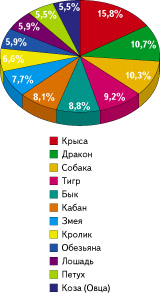 Что касается распределения по году рождения, то здесь с большим отрывом лидируют Крысы (15,81%). Люди, родившиеся в этот год чрезвычайно общительны и активны, они не могут устоять, когда перед ними возникает новая интересная проблема. Крысы обладают огромной работоспособностью и склонны ко всему инновационному. Поэтому нет ничего удивительного в том, что почти каждый шестой ИТ-специалист родился в год Крысы.