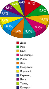 Вторую позицию по распространенности занимают Раки (10,62%). Это неудивительно, многие астрологи отмечают, что Раков отличает склонность к техническим специальностям, упорство и стремление к цели.