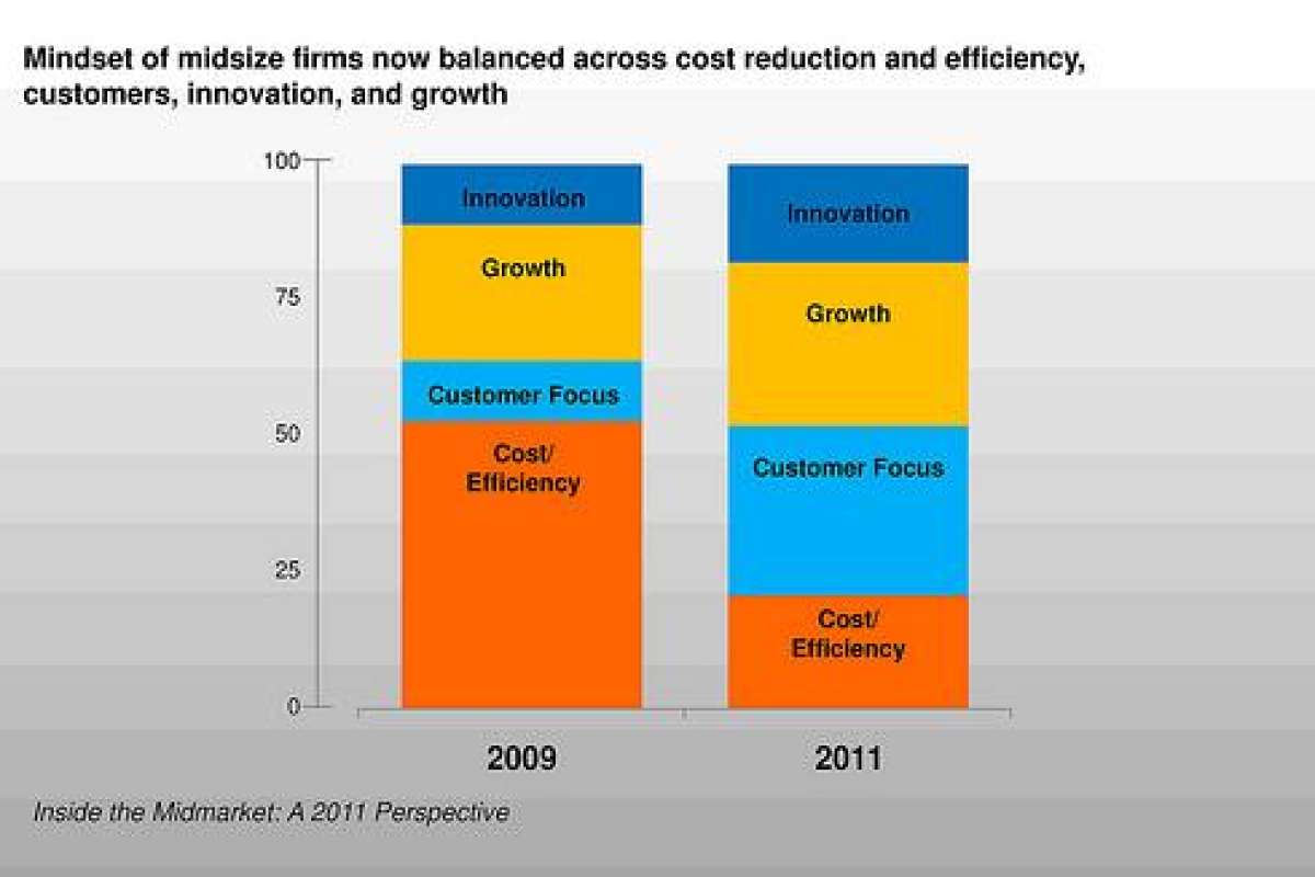 Различия между результатами нынешнего исследования и аналогичного опроса 2009 года свидетельствуют о смещении фокуса с контроля затрат и показателей эффективности на инициативы поддержки роста бизнеса. Сегодня лишь 21% респондентов характеризует свой стратегический приоритет как «контроль эффективности и затрат» (efficiency and cost control), тогда как большинство опрошенных компаний (79%) сообщают о своей концентрированности на связях с клиентами, поддержке роста и внедрении инноваций. В 2009 году упор на управлении эффективностью и контроле затрат сделали 53% респондентов, и менее половины (47%) компаний, принявших участие в исследовании, заявили о своей приверженности стратегии роста, инноваций и активного взаимодействия с клиентами. Это различие отражает возросшее признание бизнесом аналитических и прогностических технологий, которые становятся все более экономически доступными для компаний среднего масштаба.