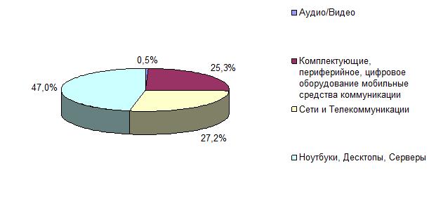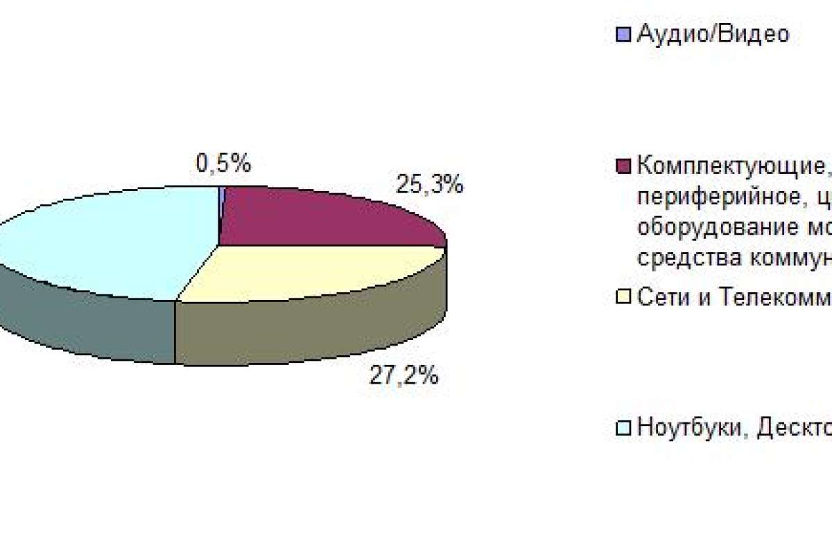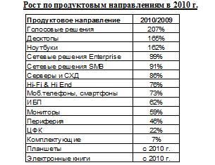 Cisco по-прежнему остается вендором “N1” . Особо стоит отметить успешный старт продукции Apple. Заключив дистрибьюторское соглашение в 2009 году, уже в 2010 оборот по продукции Apple был увеличен более чем в 16 раз и сейчас на долю данного вендора приходится 6% оборота компании. В категории ноутбуков стабильный рост показывает продукция Packard Bell, по которой уже второй год подряд мы наблюдаем сильную динамику. Оборот в 2010 по сравнению с 2009 был увеличен более чем в шесть раз, и сейчас вендор вышел на второе место в общем обороте компании. HTC переместилось с 9-го на 5-е место, увеличив оборот на 154% по сравнению с 2009 годом.