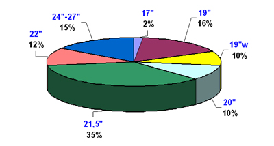 Распределение мониторов iiyama с точки зрения размера диагонали в обороте «Марвел» отличается от структуры продаж мониторов других производителей. В случае с iiyama 62% приходится на мониторы с диагональю более 21 дюйма, в то время как у большинства других производителей наибольшим спросом пользуются 17 и 19-дюймовые устройства.