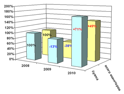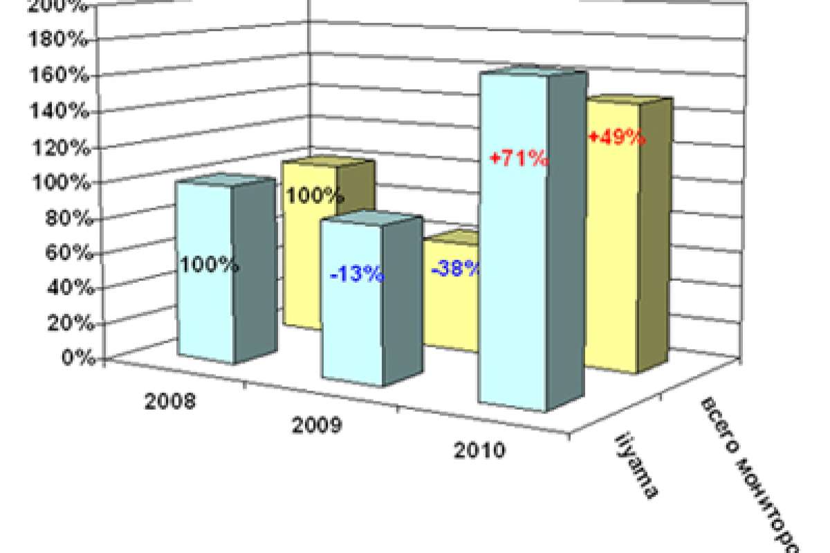 «По итогам 2010 г. продажи мониторов iiyama (в штуках) в нашей компании выросли на 71% по сравнению с 2009 годом. Мы считаем большим достижением, что в кризисный 2009 года продажи этой продукции у нас сократились не столь значительно (всего на 13%) по сравнению с мониторами всех четырех производителей (тут падение составило 38%). А за первые пять месяцев 2011 г. продажи увеличились на 75% по отношению к аналогичному периоду 2010 г.», - комментирует Сергей Пацкевич, вице-президент, директор департамента «Комплектующие, периферийное, цифровое оборудование, мобильные средства коммуникации» компании «Марвел».