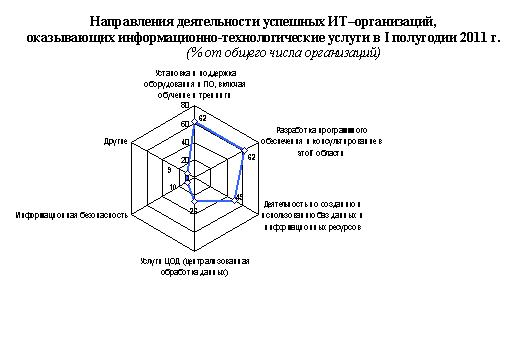 Следует отметить, что в I полугодии 2011 г. лидирующие позиции в структуре заказов, наблюдаемые у успешных (лидирующих) ИТ–организаций, занимали информационно–технологические услуги по установке и поддержке оборудования и программного обеспечения, включая обучение и тренинги, а также в сфере разработки ПО и консультирования в этой области. По данным направлениям работало 62% компаний соответственно.
