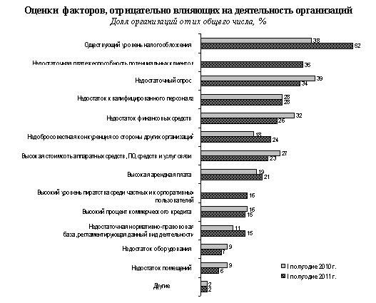 В частности, вместо ожидаемых налоговых послаблений, которые так необходимы для развития ИТ–отрасли, в 2011 г. произошла замена привычной схемы уплаты ЕСН. В результате, обновленная система налогообложения только лишь усилила фискальную нагрузку, тем самым автоматически заблокировав предпосылки для более активного становления компаний. Так, в I полугодии 2011 г. по сравнению с предшествующим периодом 2010 г. зафиксировано существенное увеличение доли предпринимателей, с 38 до 52%, по мнению которых, основное отрицательное давление на их деятельность оказал фактор «существующий уровень налогообложения». Усиление налогового бремени обеспечило радикальную перестановку в списке ограничений, определив фискальному регулированию «лидирующую» позицию не только в анализируемой группе организаций, но и в ряде других обследованных сферах услуг.