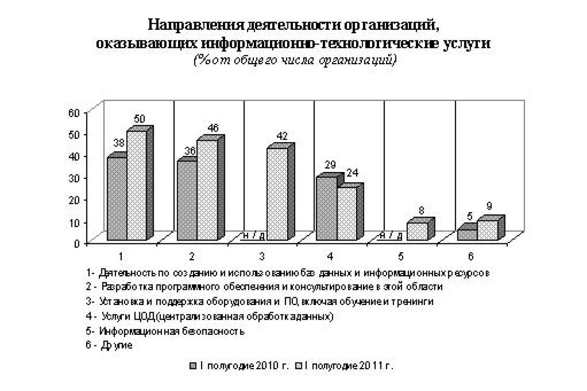 Согласно результатам пилотного обследования, в I полугодии 2011 г. одними из наиболее динамичных направлений ИТ–компаний стала деятельность по созданию и использованию баз данных и информационных ресурсов, а также разработка программного обеспечения и консультирования в этой области. По сравнению с аналогичным периодом 2010 г., в указанных сегментах было зафиксировано увеличение доли организаций, осуществлявших услуги по данным направлениям, с 38 до 50% и с 36 до 46% соответственно.