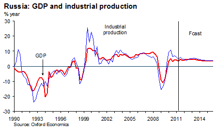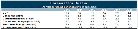 Однако Россия все еще может рассчитывать на рост экономики. Инфляция замедляется, что в свою очередь приводит к увеличению реальной заработной платы и удерживает процентные ставки, а в бюджете, принятом в прошлом месяце, в краткосрочной перспективе запланированы дополнительные расходы и повышение зарплат. После первого полугодия, которое не принесло ожидаемых результатов, прогнозируемые показатели увеличения ВВП в 2011 году были снижены до 3,8%. Несмотря на это, показатели должны снова вырасти ближе к 2012 году как следствие роста потребительского спроса.