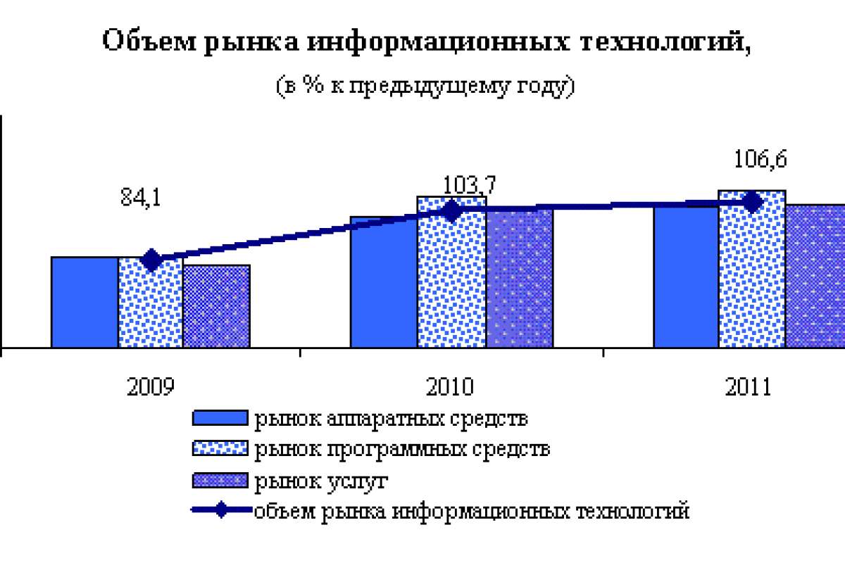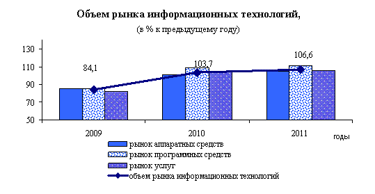 Информационные технологииПо предварительной оценке объем рынка информационных технологий в 2011 году составил 649 млрд. руб. (106,6% к уровню 2010 года в сопоставимых ценах).