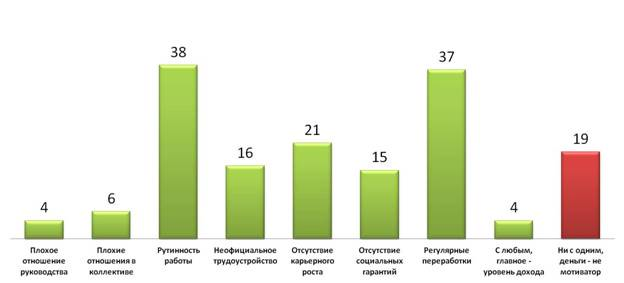 Для 21% опрошенных в этом случае неважно Отсутствие карьерного роста. 16% закроют глаза на неофициальное трудоустройство, а 15% - на Отсутствие социальных гарантий. 6% респондентов будут терпеть Плохие отношения в коллективе, а 4% - Плохие отношения с руководством. Еще 4% ради денег готовы мириться с любыми негативными явлениями на работе. В то же время, 19% опрошенных не готовы терпеть ни один из этих факторов, заявляя, что деньги, в этом случае, не являются мотиватором .