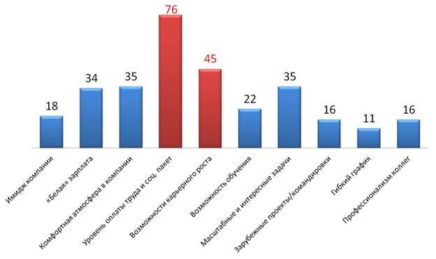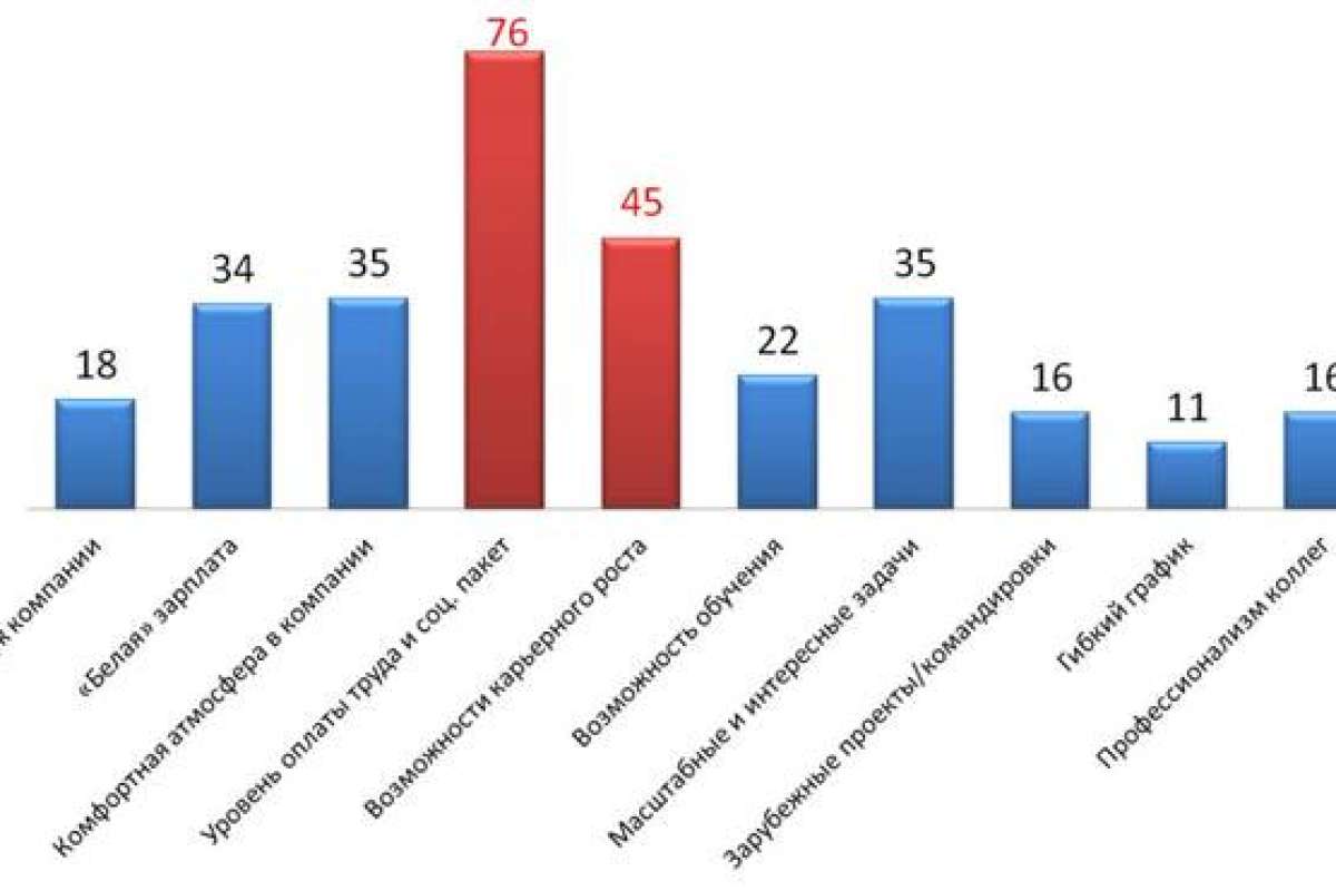Главными мотивирующими факторами для большинства российских сотрудников по-прежнему выступают Уровень оплаты труда (76% участников исследования) и Возможности карьерного роста (45%).