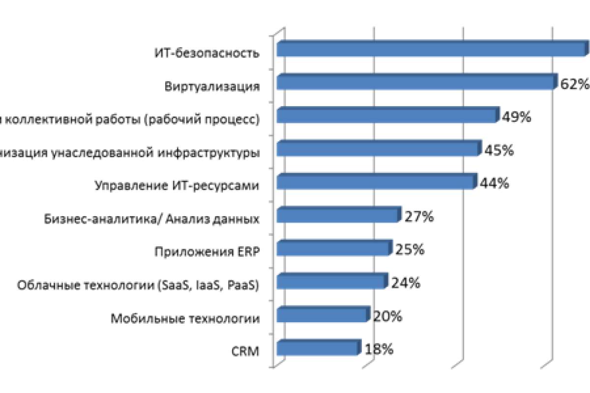 В ближайшее время наиболее востребованными у компаний региона будут технологии информационной безопасности. Приоритетное решение этой задачи для себя отметили 69% респондентов. Внедрение технологий виртуализации планируется в 62% опрошенных компаний, а в 49% ставят во главу угла внедрение технологий коллективной работы. Задачи по модернизации существующей инфраструктуры и организации управления ИТ-ресурсами считаю приоритетными 45 % организаций. Примерно четверть организаций планируют решать проблемы анализа данных, внедрения ERP, и облачных технологий. А для примерно пятой части организаций приоритетны вопросы мобильных технологий и CRM.