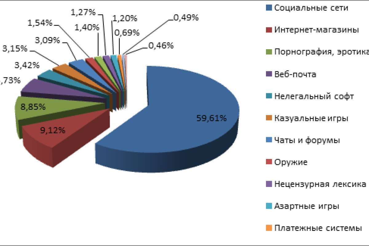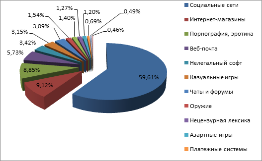 Как выяснила «Лаборатория Касперского» в ходе анализа данных облачного сервиса KSN и модуля «Родительский контроль»** в своих защитных продуктах, в Интернете российских детей привлекает определенный набор потенциально опасных ресурсов. На первом месте оказались социальные сети (59,6%), далее следуют интернет-магазины (9,1%), сайты с порнографией и эротикой (8,9%), веб-почта (5,7%), ресурсы с нелегальным ПО (3,4%), казуальные игры (3,2%) и чаты (3,1%). На остальные нежелательные для детей ресурсы – оружие, наркотики, азартные игры, платежные системы и т.п. – приходится в среднем 0,5-1,5% срабатываний «Родительского контроля».