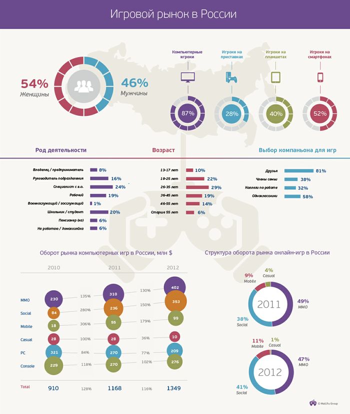 В отчете компании представлены данные об объеме рынка в 2012 году, сравнительная аналитика разных видов игр, данные о платежах пользователей, исследование образа современного российского игрока и прогноз экспертов о будущем игрового рынка.«Российская игровая индустрия активно развивается и все больше напоминает крупнейшие, давно сложившиеся западные рынки. Вместе с тем есть весьма ощутимый пробел в знаниях о рынке: сегодня в России мало комплексных, масштабных исследований, которые позволили бы молодым специалистам узнать об отрасли в целом, а признанным экспертам оценить собственное видение. Уверен, что исследование Mail.Ru Group поможет восполнить этот пробел, а полученные данные будут интересны и новичкам, и профессионалам», — сказал Владимир Никольский, вице-президент игрового направления Mail.Ru Group.