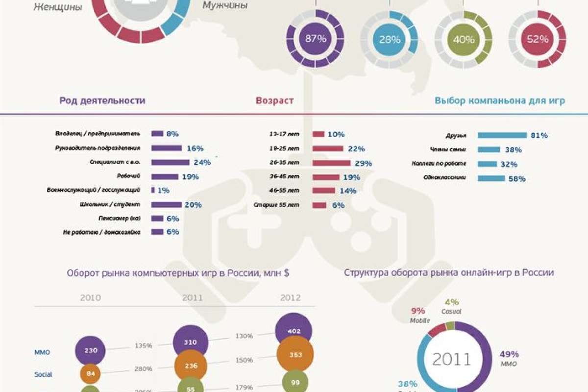 Исследование показало, что сегодня 87% интернет-аудитории России играет в игры чаще одного раза в месяц. Средний возраст геймера составил 33 года, преимущественно это специалисты с высшим образованием и студенты (44% всех игроков). Согласно полученным данным, 54% игроков – женщины. Однако социально-демографические портреты игроков показывают, что они выбирают разные игры в зависимости от пола: например, женщины чаще играют в браузерные игры, в то время как мужчины предпочитают клиентские.
