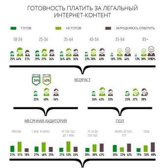 Среди мотивирующих факторов в пользу легального платного контента определяющими продолжают оставаться высокое качество (38%) и надежность, безопасность (17%). Заметно уменьшилась доля людей, считающих, что труд авторов должен оплачиваться (с 11 до 6%). В свою очередь, те, кто не готов платить за легальный контент, ссылаются на недостаток средств (35%) или считают, что «нет смысла платить за то, что можно найти бесплатно» (18%).