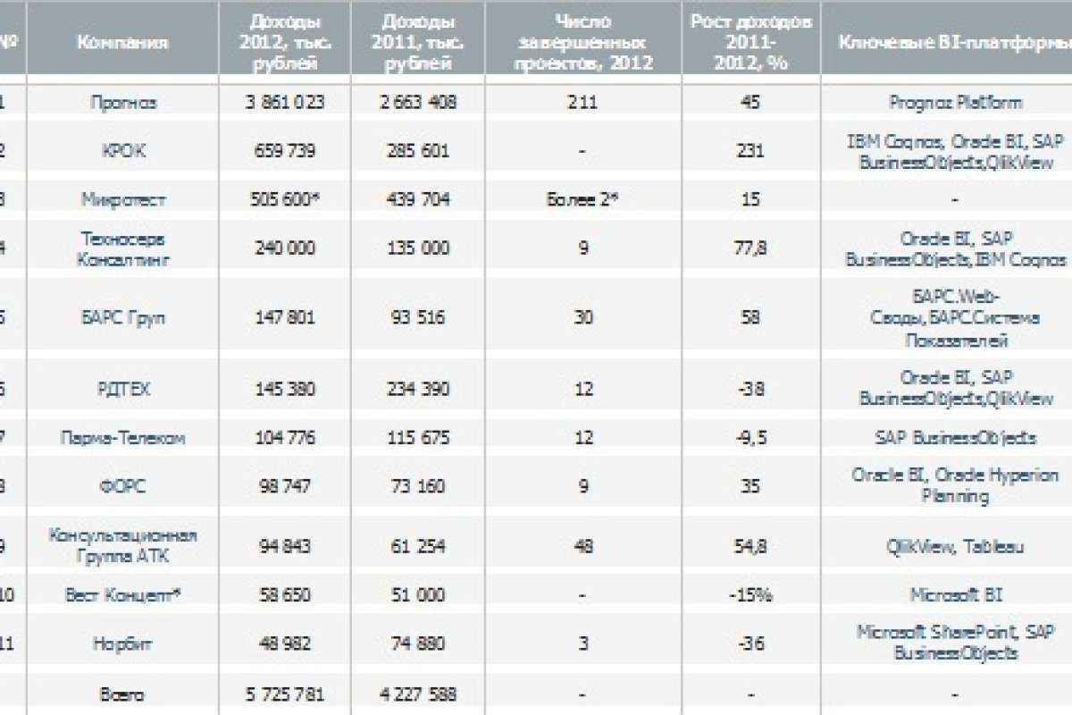 Среди внедренцев в 2012 году наиболее активны были «Прогноз» и BaseGroup Labs как вендоры, активно самостоятельно внедряющие свои же собственные платформы – Prognoz Platform и Deductor соответственно. Среди интеграторов высока была активность компаний Консультационная группа АТК, RBC Group, РДТЕХ, ФОРС и других.