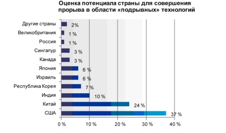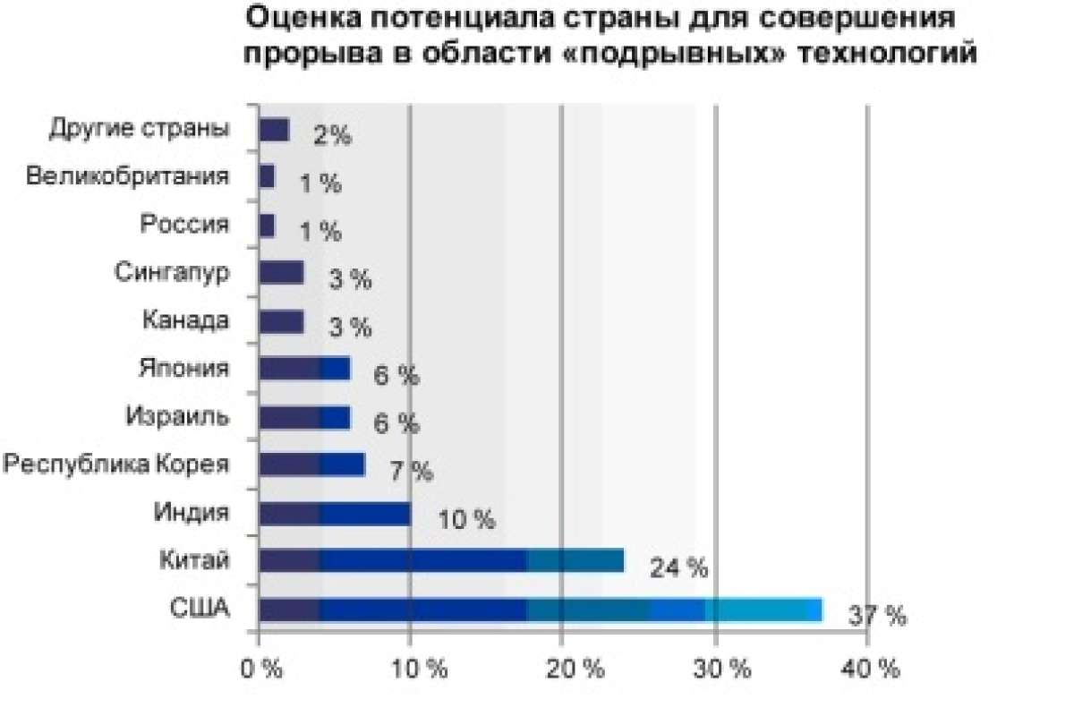 В отличие от исследования предыдущего года, когда США и Китай разделили два первых места по уровню потенциала для совершения прорыва в области революционных технологий. 37% респондентов ответили, что Соединенные Штаты Америки обладают наибольшим потенциалом для такого прорыва, в то время как в пользу Китая высказалось 24%. 10% респондентов предсказывают успех в этой области Индии, далее по списку идут Корея (7%), Япония (6%) и Израиль (6%). Россия здесь делит вместе с Великобританией 9–10 место (1%).