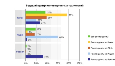 По сравнению с аналогичным исследованием прошлого года, в этом году меньше респондентов верят в появление у Силиконовой долины как центра инновационных технологий серьезного конкурента. В этот раз меньшее количество респондентов (33%), чем в 2012 г. (44%), посчитали вероятным, что в ближайшие четыре года центр разработки технологий сместится из Силиконовой долины в какую-либо другую страну мира, что еще раз подтверждает уверенность участников исследования в том, что США на ближайшие несколько лет останутся основным мировым центром технических инноваций. И неудивительно, что лишь 25% респондентов из США считают вероятным, что мировой центр технологий сместится из США в другую страну. Однако в этом году 64% респондентов из Индии и 49% из Китая ответили, что, по их мнению, центр разработки инноваций поменяет регион.