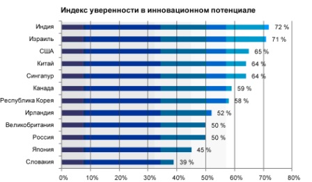 Из 10 факторов, по которым оценивался индекс уверенности в инновационном потенциале страны, самые высокие баллы, как правило, отдавались респондентами за фактор количества квалифицированных специалистов в стране и уровень развития ее технологической инфраструктуры. Самое слабое звено инновационного потенциала страны, по мнению более трети респондентов со всего мира (36%), – это неразвитая система государственных механизмов стимулирования индустрии высоких технологий.