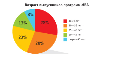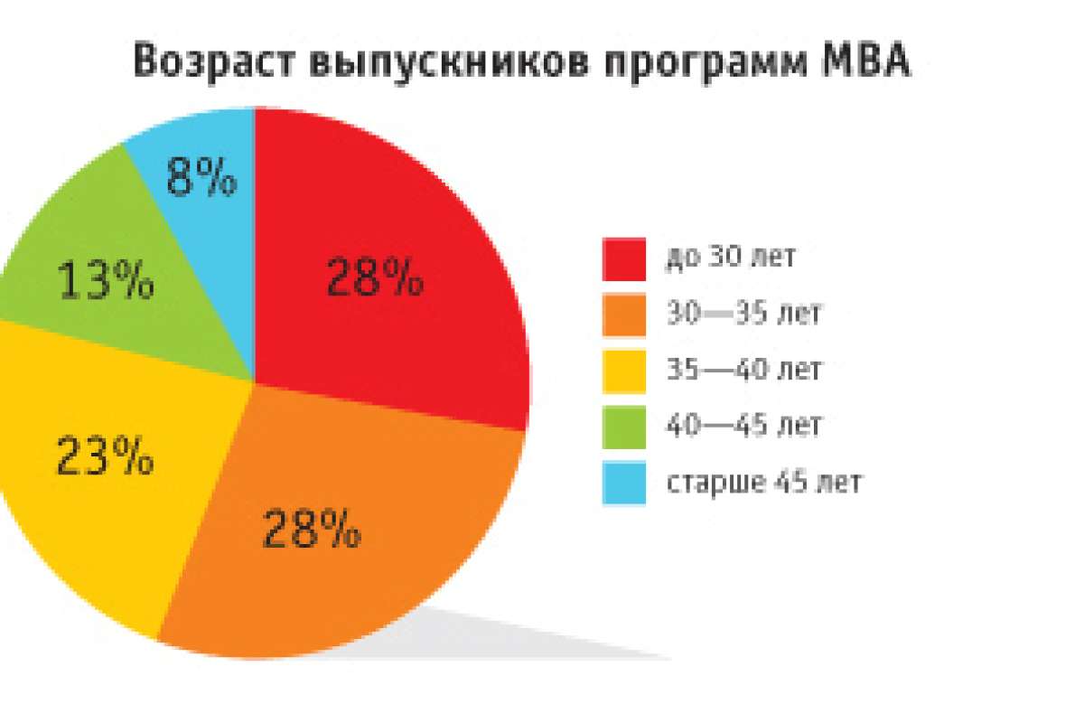 Большинство (69%) выпускников программ MBA — мужчины. За последние пять лет их доля снизилась на 8-10% за счет активного роста интереса к получению бизнес-образования со стороны женщин. Больше половины выпускников бизнес-школ получают МВА в возрасте до 35 лет.