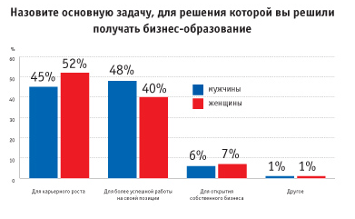 Чаще всего причиной получения степени МВА служит стремление к карьерному росту (48%) или необходимость MBA для успешной работы на текущей позиции (46%). Причем женщины называют первую причину значительно чаще, чем мужчины (52% против 45%).