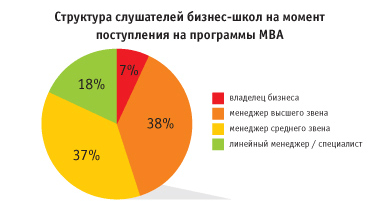 Основной поток поступающих на программы MBA составляют менеджеры высшего и среднего звена (38% и 37% соответственно). Еще 18% слушателей бизнес-школ — линейные менеджеры. По сравнению с прошлым годом наблюдается увеличение доли владельцев бизнеса среди слушателей программ MBA: если раньше они составляли 4% от всех поступивших в бизнес-школы, то сейчас их доля увеличилась до 7%.