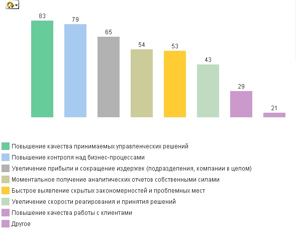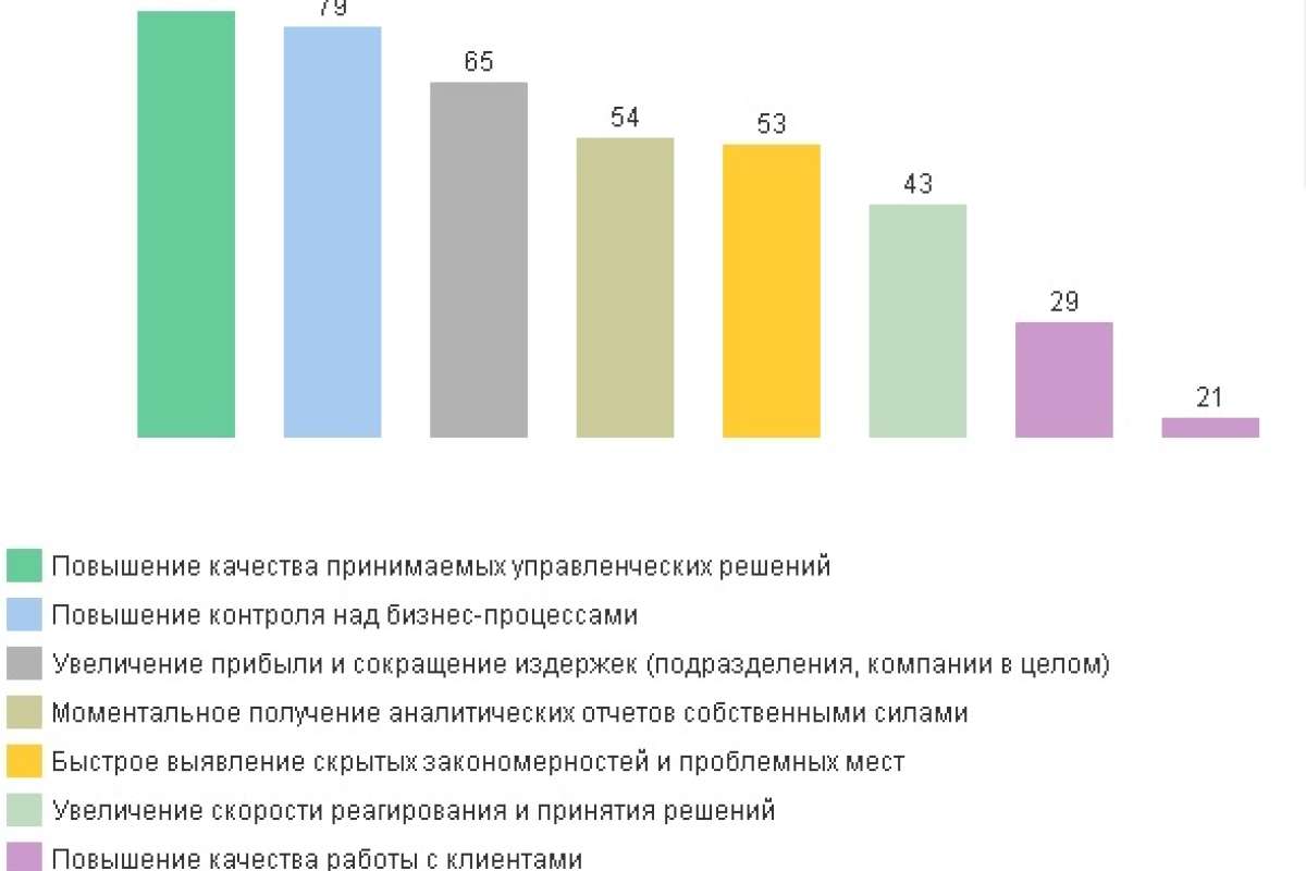 Ценность и полезность BI-систем осознают практически все опрошенные. Среди наиболее ожидаемых результатов внедрения BI-систем оказались повышение качества принимаемых решений (83 опрошенных) и рост контроля над бизнес-процессами в целом (79 опрошенных). Роста прибыли и сокращения издержек ожидают 65 участников опроса, более 50 – моментального получения отчетов собственными силами и быстрого выявления проблемных точек и скрытых закономерностей; 43 участника надеются на увеличение скорости принимаемых решений, а 29 – на повышение качества работы с клиентами. Заметим, что в данном вопросе, как и в предыдущем, респонденты могли выбрать не один ответ, а несколько, что и сказалось на результате.
