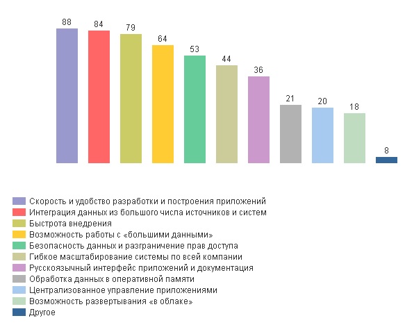 При этом скорость внедрения оказалась самым важным параметром для госструктур, финансовых и ИТ-компаний. Возможность интеграции данных из большого числа систем выбрали большинство представителей производственных, торгово-дистрибьюторских компаний и ТЭКа, а сотрудники ИТ-служб фармацевтических компаний на первое место поставили скорость и удобство построения новых приложений. Для телекома самым важным фактором стала возможность работы с большими данными.