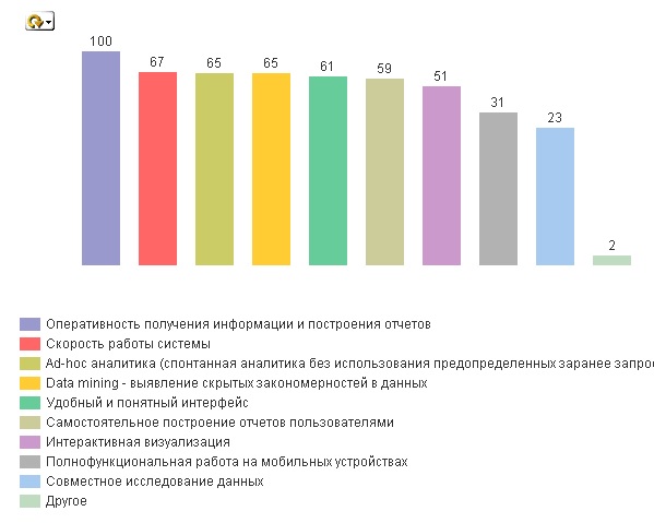 ИТ-специалисты среди возможностей, необходимых, по их мнению, бизнес-пользователям, называют прежде всего оперативность получения информации и скорость работы в целом, ad-hoc-аналитику и Data Mining, а также удобный интерфейс и возможность самостоятельного построения отчетов. Немного отстает интерактивная визуализация, а вот возможности полнофункциональной работы на мобильных устройствах и совместной работы отметили лишь некоторые ИТ-специалисты, что, скорее всего, обусловлено тем, что данные функции являются новыми для рынка и пока доступны далеко не всем.