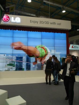 На стенде LG солировали решения для «цифровых витрин». Простейшее выглядит как обычный телевизор, но оно им не является. Например, панель для «цифровой витрины» рассчитана на более длительную непрерывную работу – если у бытовых телевизоров это время достигает 8-10 часов, то «витрина» работает 16-20, а нередко и круглосуточно, что требует решений для теплоотвода, несколько отличных от используемых в розничных моделях. Были представлены панели в антивандальном исполнении, с сенсорным управлением, поражающие воображение составные видеостены с 3D-изображением и многое другое.
