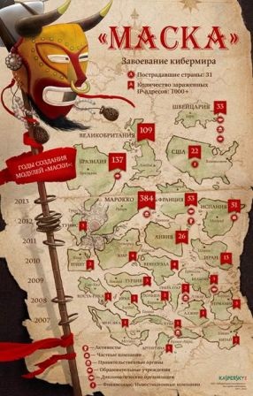 Тщательное исследование показало, что для авторов этих программ испанский является родным языком – этого ранее не наблюдалось в атаках подобного уровня. Анализ выявил, что операция «Маска» активно велась на протяжении 5 лет до января 2014 года (а некоторые образцы вредоносного ПО имели дату сборки 2007 года) – во время проведения исследования управляющие сервера злоумышленников были свернуты.