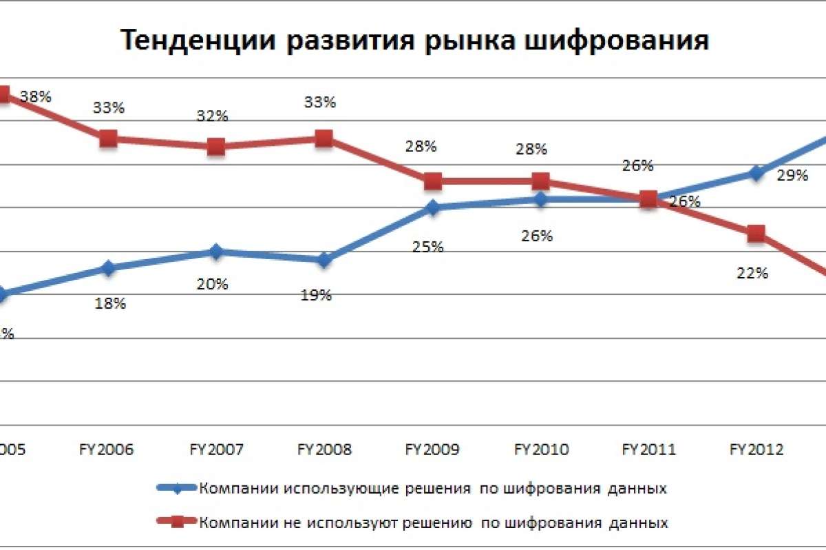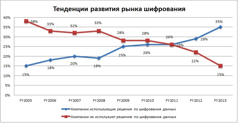 Да данным исследования видно, что всё больше организации для защиты данных используют решения для шифрования данных, на сегодняшний день это 35% опрошенных по сравнению с 29% в прошлом году. Специалисты отмечают, что утечка информации в 27% происходит по вине сотрудников организации (угроза хакерских атак составляет всего 13%).