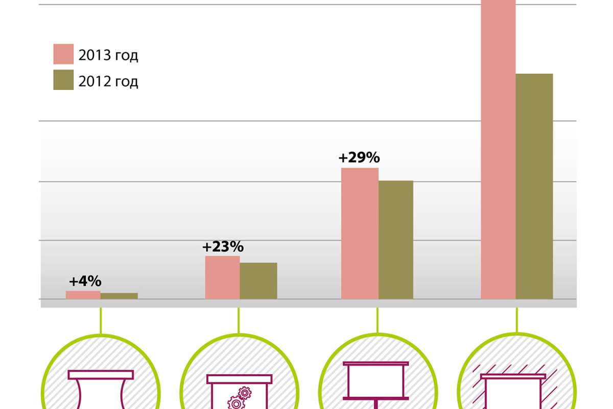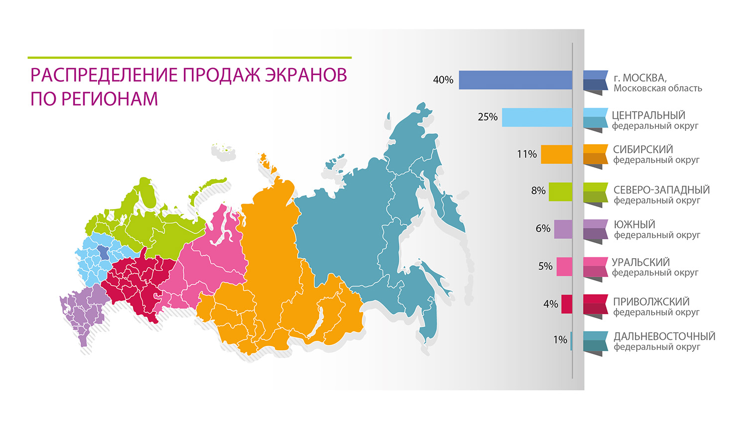 В географии продаж с существенным отрывом по-прежнему лидирует московский регион. Тем не менее, в 2013 году экраны купили более 900 клиентов из всех регионов России.