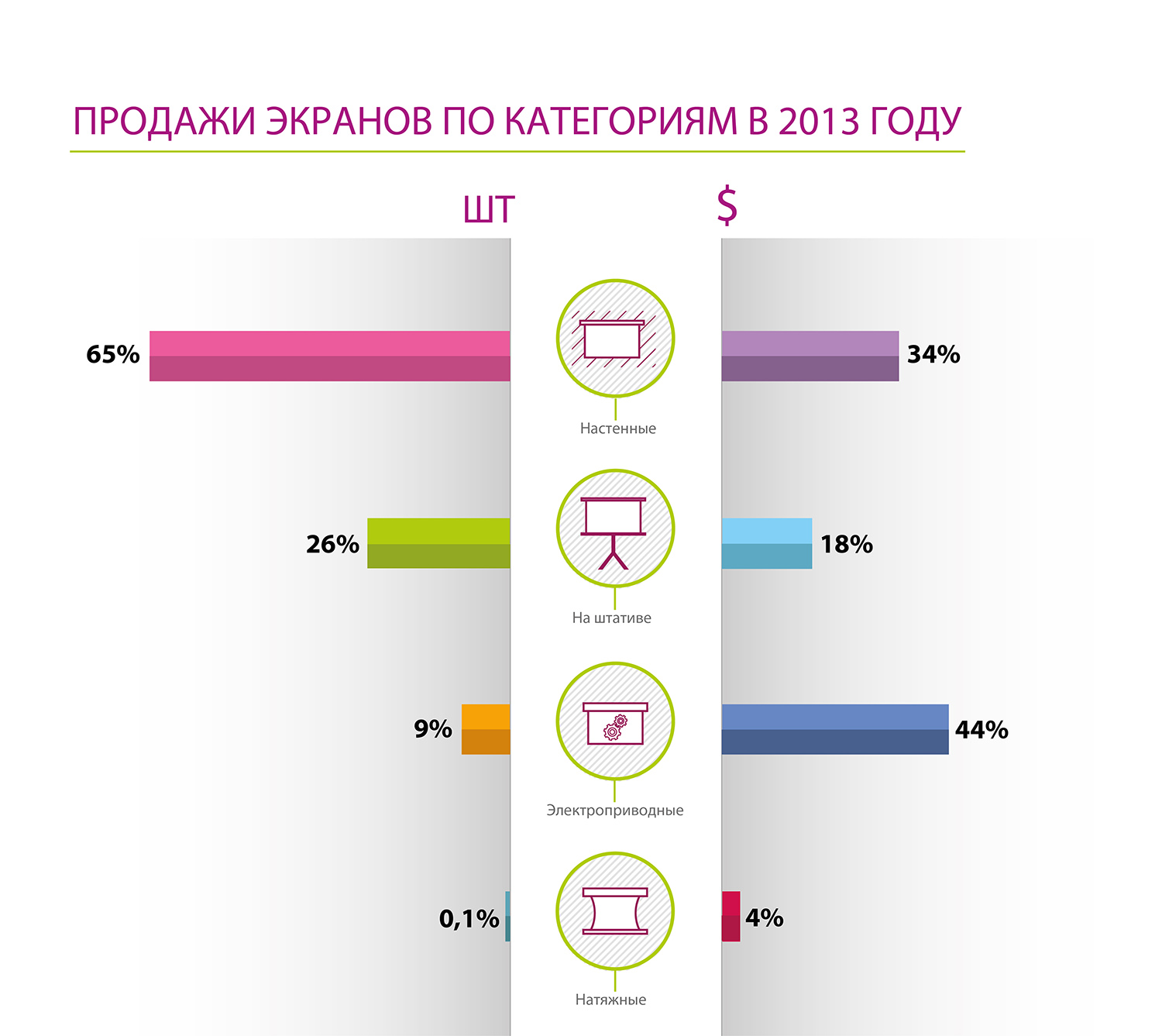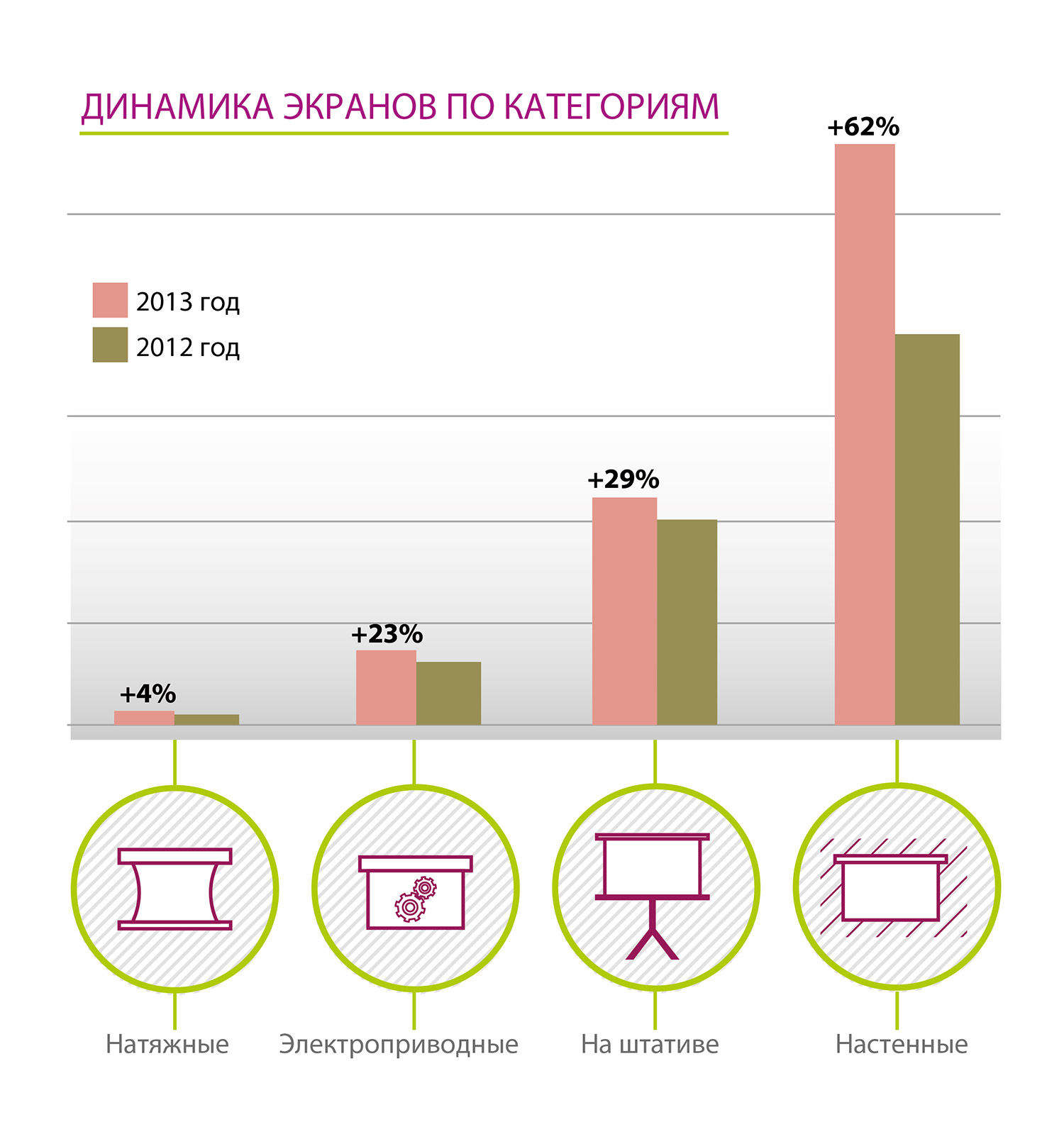 Если рассматривать динамику по категориям экранов, то наибольший рост показали настенные экраны – 62%, по-прежнему являющиеся наиболее востребованными на рынке. Также в течение последних нескольких лет наблюдается устойчивый спрос на экраны с электроприводом. В прошлом году показатель роста таких устройств составил 23%.