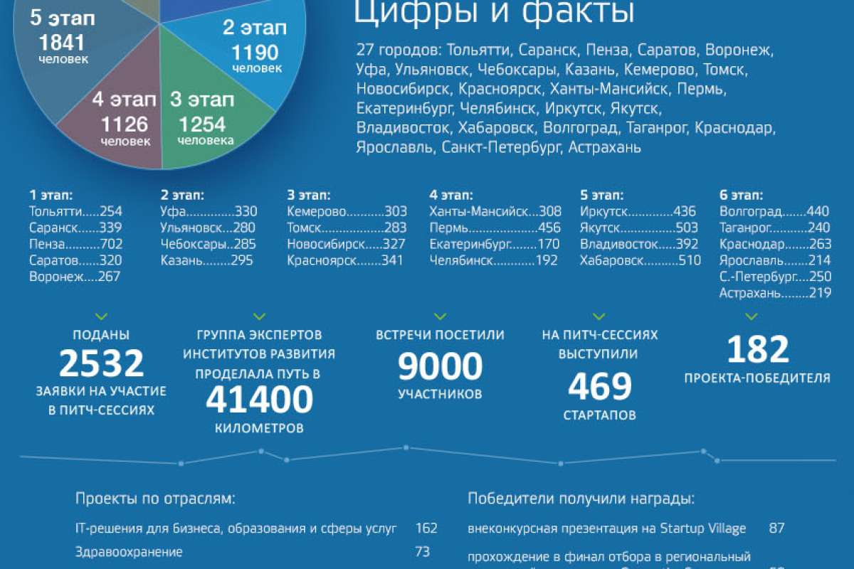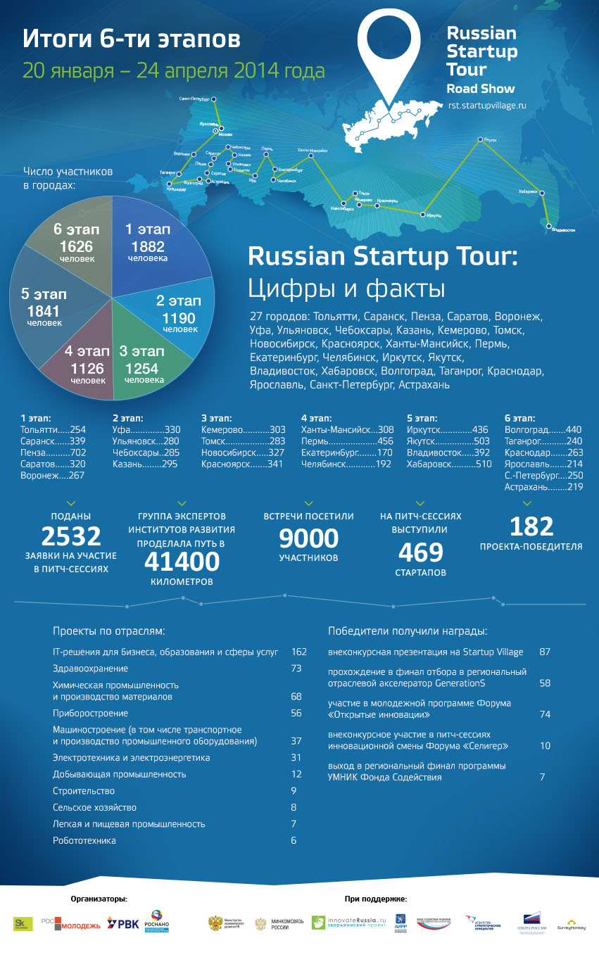 24 апреля в Астрахани завершился самый масштабный совместный проект Фонда «Сколково», Федерального агентства по делам молодежи, Российской венчурной компании (РВК) и Фонда инфраструктурных и образовательных программ (РОСНАНО) в российских регионах — роуд-шоу Russian Startup Tour.С января по апрель однодневные встречи экспертов рынка инноваций и венчурных инвестиций с авторами инновационных проектов и начинающими технологическими предпринимателями прошли в 27 российских городах от Владивостока до Санкт-Петербурга. Мероприятия Russian Startup Tour посетили более 9000 участников.